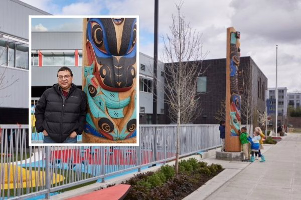 On a beautiful afternoon in late March 2022, Impact Salish Sea Elementary School proudly celebrated Brian Perry’s art installation – a set of traditional Cast Salish carvings entitled “Remember the Teachings.” The work is a suite of three works that include a prominent welcome pole flanked by two canoe-forms that act as benches. Brian was selected to develop an original public artwork for the school which is located at Othello Square in South Seattle. He is a member of the S’Klallam tribe and a representative of the Coast Salish people.